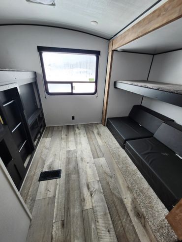 30 Foot Trailer, 1 Slide Out, 20 Foot Awning, 7 Year Superior Warranty with Exterior Protection - Solar Panels on Roof of Trailer - Site has 420 lb propane tank - Trailer has two bedrooms, master room has a Queen bed with a 24" TV in room, second bedroom has 4 bunks bottom bunk folds into King bed